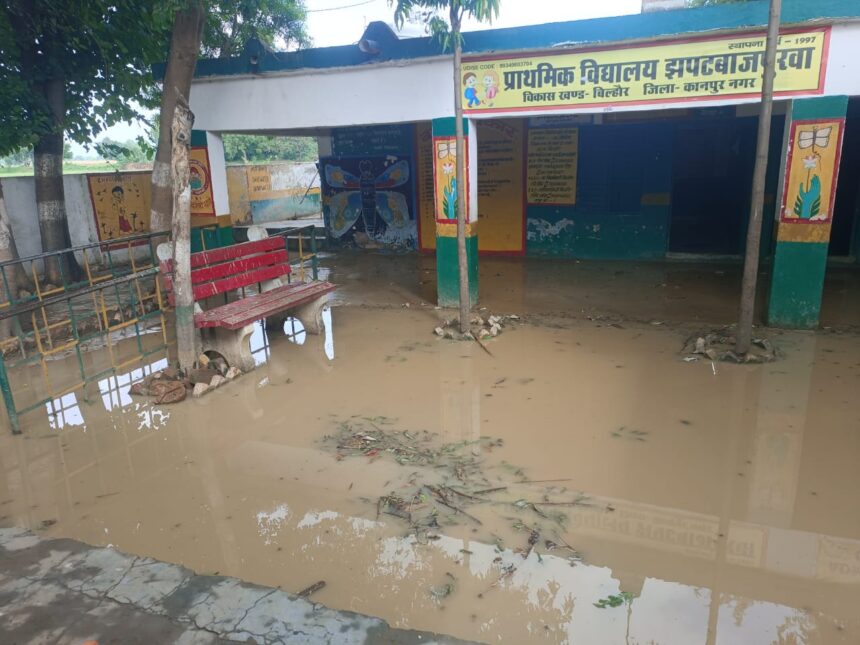 Kanpur जनपद के बिल्हौर ब्लॉक के प्राथमिक विद्यालय झपटवाजपुरवा में बारिश के बाद हुआ जलभराव शिक्षा व्यवस्था पर एक बड़ा सवाल खड़ा कर रहा है। विद्यालय परिसर में जमा गंदा पानी न केवल छात्रों के आवागमन में बाधा बन रहा है, बल्कि स्कूल की नियमित पढ़ाई भी बुरी तरह से प्रभावित हो रही है।